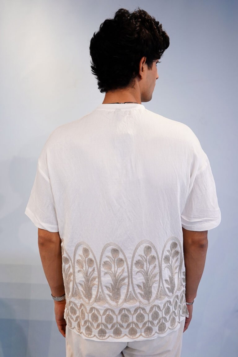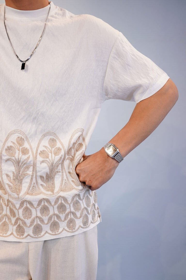 Minimal at first glance, but rich in detail—this Embroidered Statement T-Shirt is designed for those who appreciate subtle luxury. Made from soft, breathable fabric, it offers a relaxed fit for all-day comfort. The intricate embroidery along the hem adds a refined, standout touch, making it more than just a basic tee.